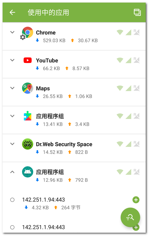 使用中的应用部分实时显示由设备上安装的应用当前所建立的连接列表。利用这一部分可以快捷监控应用的网络流量。 防火墙初始页面显示的是流量最大的应用。点击更多信息可打开当前连接的完整列表。 使用中的应用屏幕(见图24)显示每一应用的以下信息: •进出港流量总量。 •数据传输权限,使用Wi-Fi、移动网络和漫游。 •存在自定义设置。数据传输权限发生更改的应用出现标志 •存在系统威胁且其互联网连接已被阻止。数据传输权限发生更改的系统应用出现标志 应用建立的连接 点击使用中的应用屏幕应用名称左侧的图标 •已建立的连接列表; •每一连接的进出港流量总量。 •连接规则: ▫ ▫ ▫ ▫ 复制连接地址的操作是点击并长按连接地址一行。地址会复制到剪贴板。 点击连接,打开屏幕连接。 连接规则 可指定允许、禁止和重定向规则来管理应用所建立的连接(参见连接规则)。创建或编辑规则需点击连接右侧的 应用排序 对应用列表进行排序需点击屏幕右下角的图标 •按照流量递减:流量最大的应用在前; •按照流量递增:流量最小的应用在前; •按字母表顺序A至Z; •按字母表顺序Z至A。 默认排序是按照流量递减(流量最大的应用在前)。恢复默认排序需点击过滤器屏幕的图标 搜索 权限可利用名称搜索快速查找您需要的应用。操作是点击屏幕右下角的图标 如需随时查看当前活跃的互联网连接,监控进出流量大小,可启用浮动窗口,覆盖所有应用程序窗口显示。 启用浮动窗口的操作 1.打开屏幕使用中的应用后点击屏幕右上角的图标 2.允许应用覆盖其他应用显示浮动窗口。 如果允许弹窗覆盖其他窗口显示的设置被撤回,则不会再显示弹窗。重新启用需点击屏幕右上角的图标
