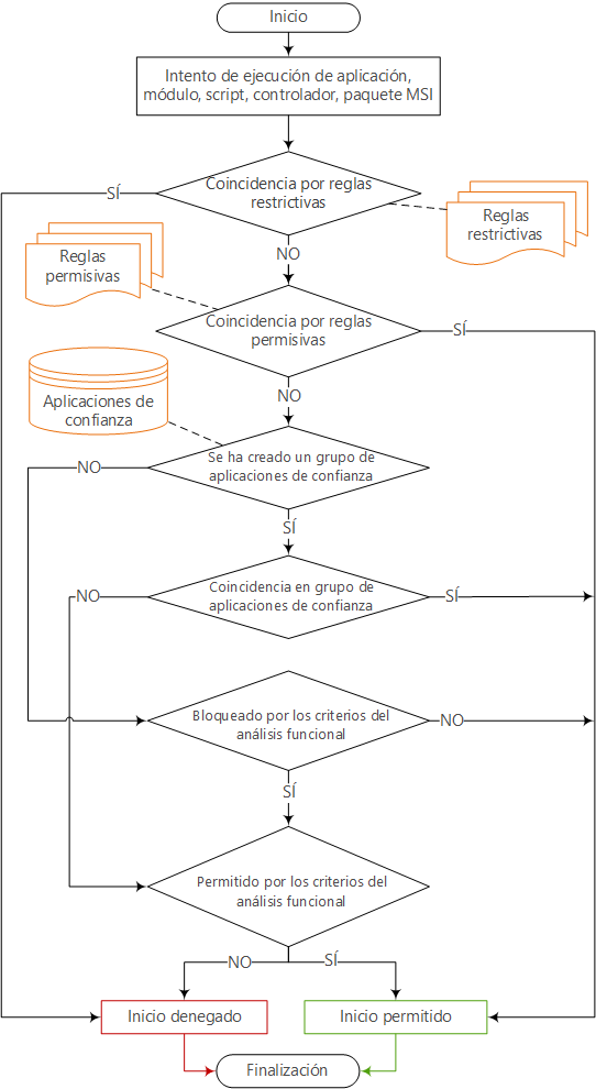 Con el componente Control de aplicaciones, puede regular qué aplicaciones, módulos, intérpretes de scripts, controladores y paquetes MSI están permitidos y cuáles están prohibidos para ejecutarse en estaciones protegidas de la red antivirus en la que está instalado Agente Dr.Web para Windows. El flujo de trabajo para el Control de aplicaciones se muestra a continuación.