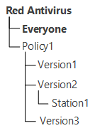 Herencia de la configuración de la estación de las políticas Si se asigna una política a una estación, se establece la herencia de la configuración de la estación de la configuración de la política. Al cambiar la configuración de la política, estos cambios son heredados por las estaciones a las que se asigna esta política, excepto en los casos en que las estaciones han sido personalizadas. Al crear una estación, puede especificar cuál de las políticas se asignará a la estación. La política se puede cambiar en cualquier momento durante el curso del trabajo. Si no se asigna ninguna política, la configuración se heredará del grupo primario. Las políticas no tienen una estructura de herencia jerárquica. Cuando se crea una política, su configuración se copia como configuración personal del objeto especificado (de forma predeterminada, esta política Default policy). Solo una versión de la política está actualizada y su configuración es la configuración de la política en sí. Solo se puede asignar la versión actual a las estaciones. Por ejemplo: La estructura de la lista jerárquica es el siguiente árbol:
