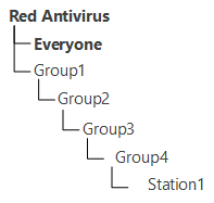 En las condiciones de los grupos anidados, si no se especifican ajustes personales para una estación, la herencia de elementos de configuración se lleva a cabo de acuerdo con la estructura de los grupos anidados. La búsqueda se realiza hacia arriba en el árbol jerárquico, comenzando desde el grupo primario de la estación, su grupo parental y luego hasta el elemento raíz del árbol. Si no se encontró ninguna configuración personal, los elementos de configuración del grupo se heredan Everyone. Por ejemplo: La estructura de la lista jerárquica es el siguiente árbol: