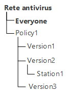 Ereditarietà delle impostazioni delle postazioni da criteri Se a una postazione è assegnato un criterio, viene impostata l'ereditarietà delle impostazioni della postazione dalle impostazioni del criterio. Se vengono modificate le impostazioni di un criterio, le postazioni a cui è assegnato questo criterio ereditano le modifiche, ad eccezione dei casi in cui alle postazioni sono state assegnate impostazioni individuali. Quando viene creata una postazione, è possibile indicare quale dei criteri verrà assegnato alla postazione. Il criterio può essere sostituito in qualsiasi momento durante l'utilizzo. Se nessun criterio verrà assegnato, la postazione erediterà le impostazioni dal gruppo primario. I criteri non hanno la struttura di ereditarietà gerarchica. Quando viene creato un criterio, le sue impostazioni vengono copiate come impostazioni individuali da un oggetto impostato (di default questo è il criterio Default policy). Solo una delle versioni del criterio è corrente e le sue impostazioni sono le impostazioni del criterio stesso. Solo la versione corrente può essere assegnata alle postazioni. Per esempio: La struttura della lista gerarchica è il seguente albero: