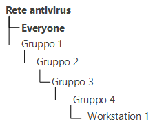 Se ci sono gruppi nidificati, se per la postazione non sono state definite impostazioni individuali, essa eredita elementi di configurazione secondo la struttura dei gruppi nidificati. La ricerca viene eseguita dal basso in alto dell'albero gerarchico, partendo dal gruppo primario della postazione, dal suo gruppo padre e così via fino all'elemento radice dell’albero. Se durante la ricerca non sono state rilevate impostazioni individuali, la postazione eredita gli elementi di configurazione del gruppo Everyone. Per esempio: La struttura della lista gerarchica è il seguente albero: