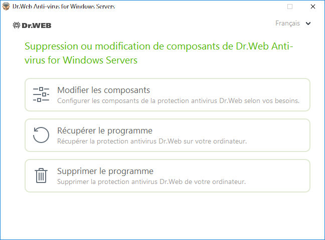 Figure 3. Assistant de suppression/modification des composants 4.Sélectionnez l’une des options : •Modifier les composants. Dans la fenêtre qui apparaît, cochez les cases contre les composants à ajouter et décochez les cases contre les composants à désinstaller. Dés que la configuration est déterminée, cliquez sur Appliquer. •Récupérer le programme, s’il faut restaurer la protection antivirus sur votre ordinateur. Cette fonction est appliquée au cas où certains composants de Dr.Web seraient endommagés. •Supprimer le programme, pour supprimer tous les composants installés. |
