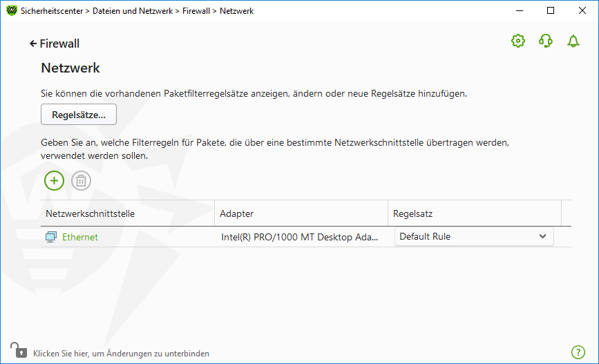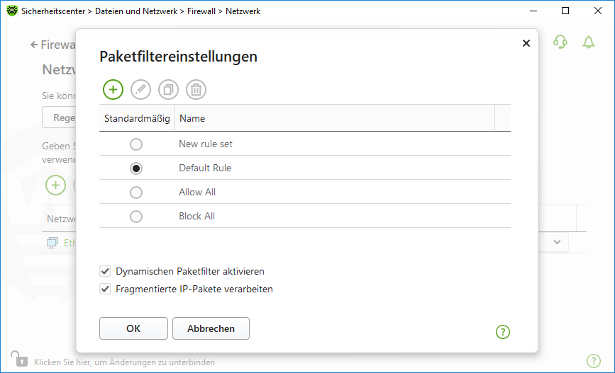 Im Fenster Netzwerk können Sie einen Regelsatz für die Filterung von Paketen festlegen, die über eine bestimmte Netzwerkschnittstelle übertragen werden. So wechseln Sie zum Fenster Netzwerk 1.Öffnen Sie das Menü von Dr.Web 2.Wählen Sie im angezeigten Fenster den Bereich Dateien und Netzwerk aus. 3.Stellen Sie sicher, dass Dr.Web im Administratormodus ausgeführt wird (das Vorhängeschloss unten im Programmfenster ist geöffnet 4.Klicken Sie auf die Kachel Firewall. Das Fenster mit den Einstellungen der Komponente erscheint. 5.Klicken Sie auf den Link Erweiterte Einstellungen, um die erweiterten Einstellungen einzublenden. 6.Klicken Sie im Einstellungsbereich Betriebsparameter für bekannte Netzwerke auf Ändern. Das Fenster mit der Liste von Netzwerkschnittstellen, für die Regeln festgelegt sind, wird geöffnet. ![]() Abbildung 55: Regelsätze für Netzwerkschnittstellen 7.Finden Sie die gewünschte Schnittstelle in der Liste und ordnen Sie dieser Schnittstelle einen entsprechenden Regelsatz zu. Wenn der passende Regelsatz fehlt, erstellen Sie einen neuen Regelsatz. Die Firewall wird mit folgenden vordefinierten Regelsätzen geliefert: •Default Rule. Dieser Regelsatz beschreibt die häufigsten Netzwerkkonfigurationen und Angriffe (er wird standardmäßig für alle neuen Netzwerkschnittstellen verwendet). •Allow All. Alle Pakete werden zugelassen. •Block All. Alle Pakete werden gesperrt. Um schnell zwischen den Filtermodi umschalten zu können, erstellen Sie zusätzliche Regelsätze. Um alle verfügbaren Netzwerkschnittstellen anzuzeigen oder eine neue Schnittstelle zur Tabelle hinzuzufügen, klicken Sie auf die Schaltfläche Mit der Schaltfläche Um die Parameter einer Netzwerkschnittstelle anzuzeigen, klicken Sie auf den Namen der Netzwerkschnittstelle. Paketfiltereinstellungen Um die vorhandenen Regelsätze zu verwalten und neue Regelsätze hinzuzufügen, wechseln Sie zum Fenster Paketfiltereinstellungen, indem Sie auf die Schaltfläche Regelsätze klicken. ![]() Abbildung 56: Fenster Paketfiltereinstellungen Auf dieser Seite können Sie Folgendes tun: •Filterregelsätze einrichten, indem Sie neue Regeln erstellen, bestehende Regeln bearbeiten und nicht mehr benötigte Regeln löschen. •Zusätzliche Filterparameter festlegen. Um einen Regelsatz einzurichten, folgen Sie einer der folgenden Vorgehensweisen: •Um einen Regelsatz für eine Netzwerkschnittstelle zu erstellen, klicken Sie auf •Um einen bestehenden Regelsatz zu bearbeiten, wählen Sie ihn aus der Liste aus und klicken Sie auf •Um eine Kopie eines bestehenden Regelsatzes hinzuzufügen, klicken Sie auf •Um einen Regelsatz zu entfernen, wählen Sie ihn aus und klicken Sie auf Um zusätzliche Einstellungen für die Paketfilterung festzulegen, aktivieren Sie im Fenster Paketfiltereinstellungen die folgenden Kontrollkästchen: