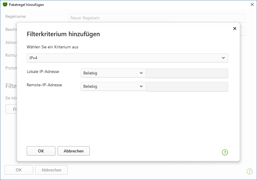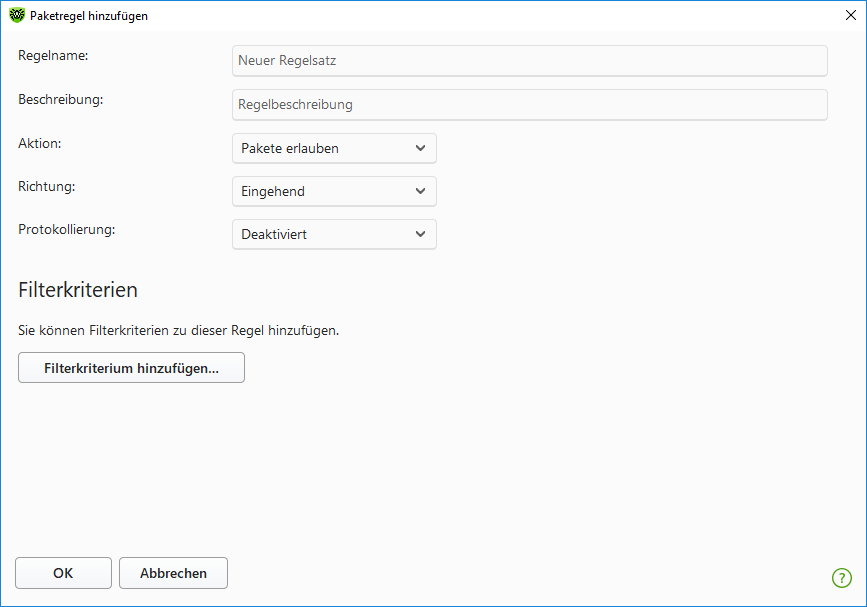 So können Sie eine Filterregel bearbeiten oder hinzufügen 1.Klicken Sie im Dialog zur Bearbeitung des Paketfilterregelsatzes auf die Schaltfläche ![]() Abbildung 58: Hinzufügen einer Filterregel 2.Geben Sie die folgenden Regelparameter an: