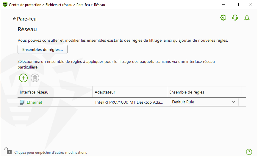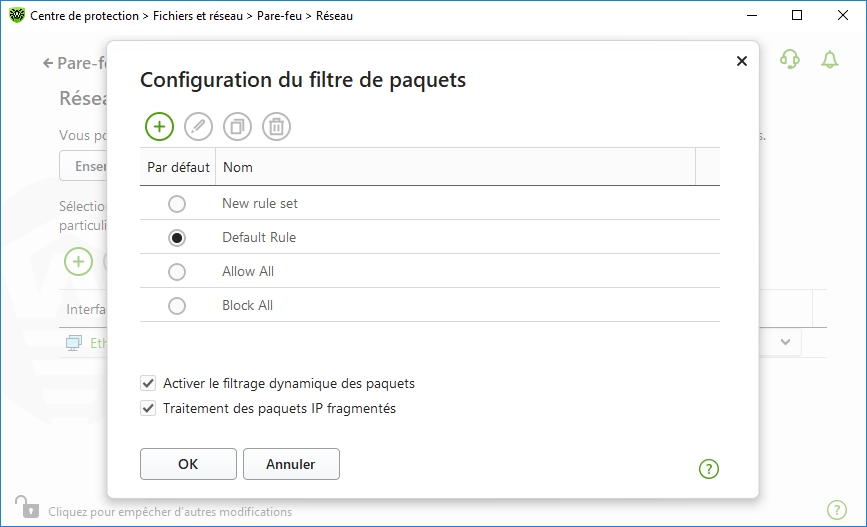 Dans la fenêtre Réseau, vous pouvez configurer l’ensemble de règles de filtrage des paquets transmis via une interface particulière. Pour accéder à la fenêtre Réseau 1.Ouvrez le menu de Dr.Web 2.Dans la fenêtre qui s’ouvre, sélectionnez la section Fichiers et réseau. 3.Assurez-vous que Dr.Web fonctionne en mode administrateur (le cadenas en bas du logiciel est ouvert 4.Cliquez sur la vignette Pare-feu. La fenêtre de configuration du composant va s’ouvrir. 5.Ouvrez le groupe Paramètres avancés. 6.Dans la section de paramètres Paramètres de fonctionnement pour les réseaux connus, cliquez sur Modifier. La fenêtre qui s’ouvre contient la liste des interfaces réseau pour lesquelles les règles sont spécifiées. ![]() Figure 55. Ensembles de règles pour les interfaces réseau 7.Sélectionnez dans la liste l’interface de votre choix et l’ensemble de règles correspondant. Si l’ensemble de règles nécessaire n’est pas présent dans la liste, créez-le. Le Pare-feu est fourni avec les ensembles de règles suivants : •Default Rule : cet ensemble inclut des règles décrivant les configurations systèmes les plus fréquentes et prévenant contre les attaques réseaux communes. Cet ensemble de règles est utilisé par défaut pour les nouvelles interfaces réseaux ; •Allow All : laisser passer tous les paquets ; •Block All : bloquer tous les paquets. Pour passer rapidement d’un mode de filtrage à un autre, vous pouvez créer des ensembles de règles de filtrage. Pour afficher toutes les interfaces disponibles ou ajouter une nouvelle interface dans le tableau, cliquez sur le bouton Vous pouvez supprimer les interfaces réseau inactives du tableau affiché en cliquant sur Pour consulter les paramètres d’une interface réseau, cliquez sur son nom. Configuration du filtre de paquets Pour gérer les ensembles de règles existants et ajouter de nouveaux ensembles, ouvrez la fenêtre Configuration du filtre de paquets en cliquant sur Ensembles de règles. ![]() Figure 56. Fenêtre Configuration du filtre de paquets Sur cette page, vous pouvez : •configurer les ensembles de règles de filtrage en ajoutant de nouvelles règles, en modifiant ou en supprimant les règles existantes ; •configurer les paramètres avancés du filtrage. Création d’un ensemble de règles Pour créer un ensemble de règles, effectuez l’une des actions suivantes : •pour créer un ensemble de règles d’une interface réseau, cliquez sur •pour éditer un ensemble de règles, sélectionnez-le dans la liste et cliquez sur •pour ajouter une copie de l’ensemble de règles existant, cliquez sur •pour supprimer un ensemble de règles, sélectionnez-le et cliquez sur Pour spécifier les paramètres avancés du filtrage de paquets, dans la fenêtre Configuration du filtre de paquets, cochez les cases suivantes :