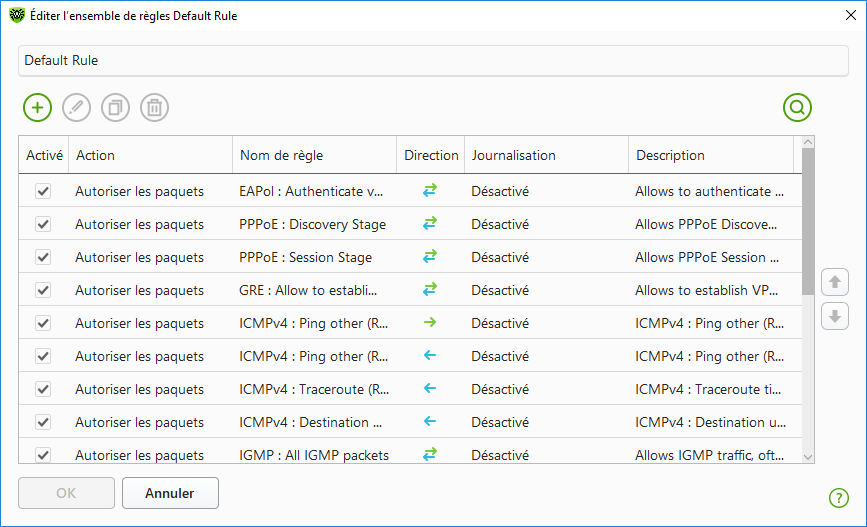La fenêtre Éditer l’ensemble de règles donne la liste des règles de filtrage de paquets pour l’ensemble sélectionné. Vous pouvez configurer la liste en ajoutant de nouvelles règles pour une application ou modifier les règles existantes et l’ordre de leur exécution. Les règles sont appliquées selon leur ordre dans la liste. ![]() Figure 57. Ensemble de règles de filtrage de paquets Pour chaque règle dans un ensemble, les informations suivantes s’affichent :